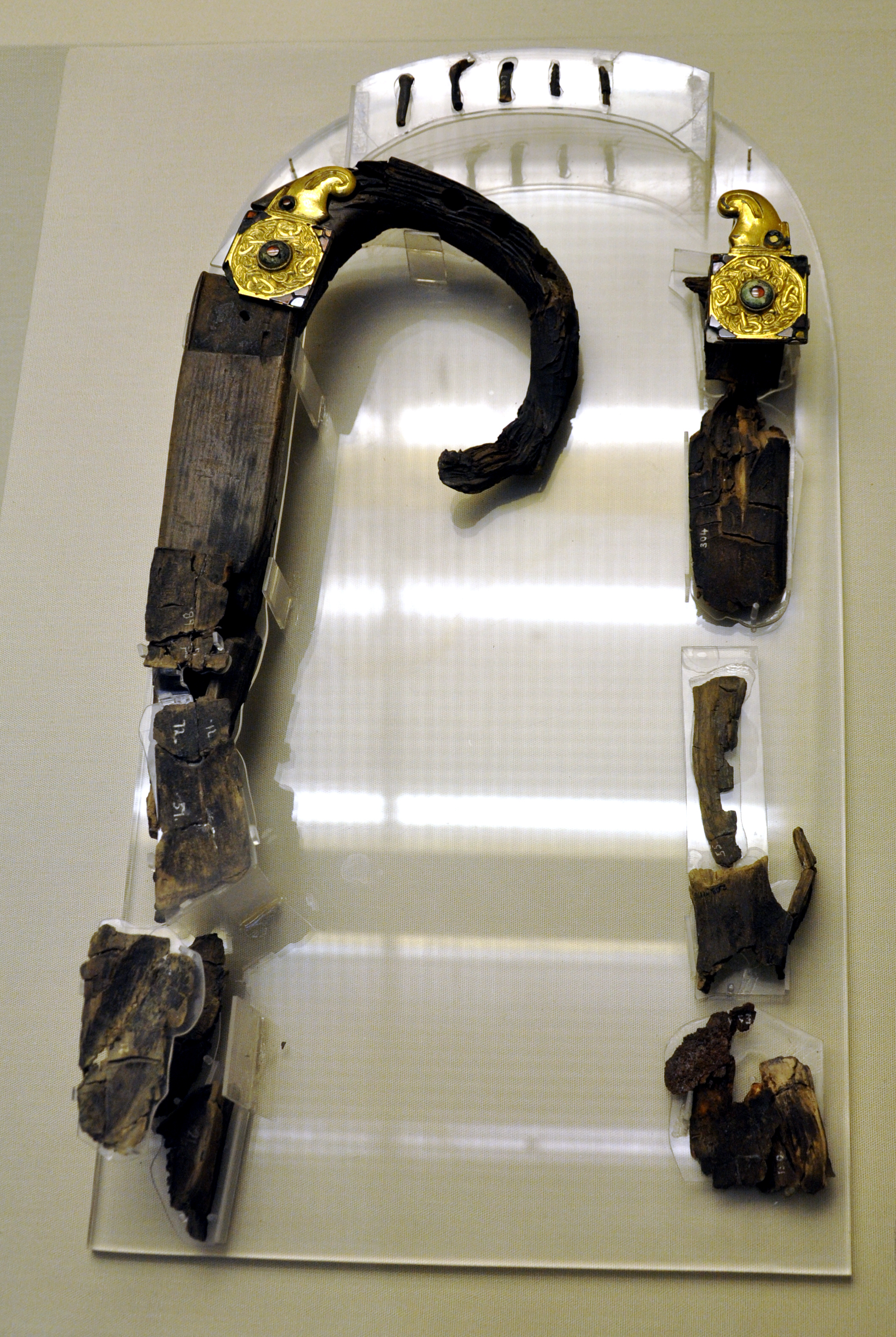 Au cœur de ce landskip funéraire de 28 mètres de long furent mis au jour de nombreux objet prestigieux suggérant l’importance du personnage inhumé, parmi lesquels : un remarquable casque à facial serti d’or et de grenats et présentant des figurations païennes, plusieurs armes ainsi que de nombreux objets en or mais enfin et surtout, les restes d’une lyre en érable ornementée d’appliques en or fin représentant des volatiles, le tout, vraisemblablement entreposé dans un sac en peau de castor dont l’assaut du temps n’aura laissé que quelques poils.
